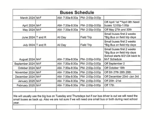 Kings Kids Day Care is considered to be the primary user of these vehicles and have priority in their use.
